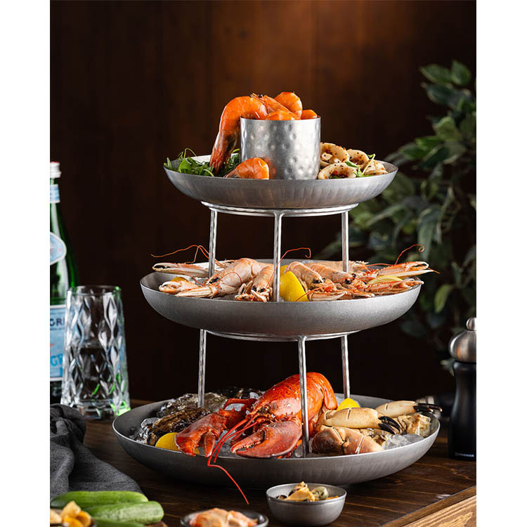 Indulge in the epitome of luxury with our seafood tower, a true masterpiece of versatility and sophistication. This exquisite tower serves as both an eye-catching statement piece and a collection of individual components designed for a variety of uses. The tower includes two stands and three serving bowls, each featuring a luxurious hammered texture that exudes opulence. These bowls come in three different sizes, providing flexibility for any occasion. Elevate your dining experience with this seafood tower, where luxury meets versatility, and every serving becomes a work of art. Now available in Vintage Steel, Vintage Gold, Vintage Black and Vintage Copper as well as original stainless steel