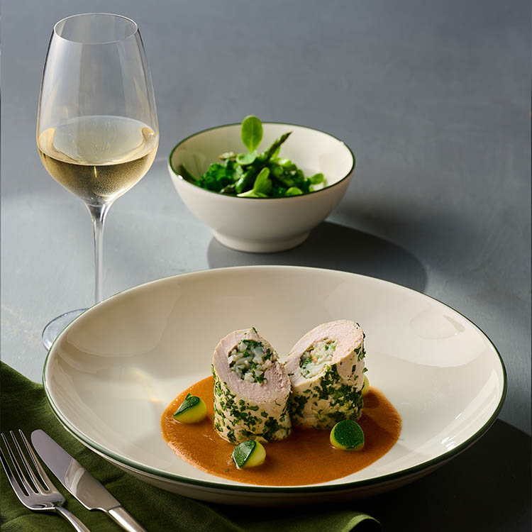 Finished with a soft, earthy green band, Modest Green brings a fresh, natural accent to the table, perfect for elevating seasonal dishes with understated character. Dishwasher safe, Lifetime Edge Chip Gaurentee, Microwave safe.