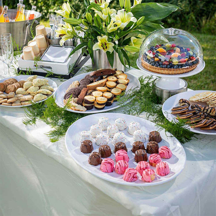 Add elegance to any buffet presentation with our collection of crisp, white serving bowls and platters. Each melamine-constructed piece is made to endure daily use, is lightweight, dishwasher safe and break-resistant. Use together for a classic all-white presentation or pair with coordinating plateware for a custom look. These oval platters are perfect for showcasing pasta, fresh fruit, salads and more.