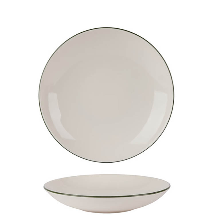 Finished with a soft, earthy green band, Modest Green brings a fresh, natural accent to the table, perfect for elevating seasonal dishes with understated character. Dishwasher safe, Lifetime Edge Chip Gaurentee, Microwave safe.