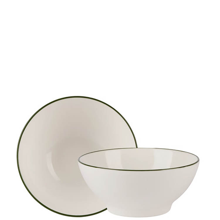 Finished with a soft, earthy green band, Modest Green brings a fresh, natural accent to the table, perfect for elevating seasonal dishes with understated character. Dishwasher safe, Microwave safe.