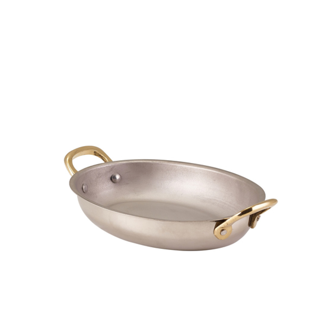 Add a luxurious touch to your food presentation with the GenWare Stainless Steel Oval Dishes. Perfect for serving premium dishes, these eye-catching dishes blend modern style with vintage charm. The polished stainless steel finish paired with elegant brass handles creates a sophisticated look, making them ideal for upscale restaurants, bistros, and contemporary dining settings.