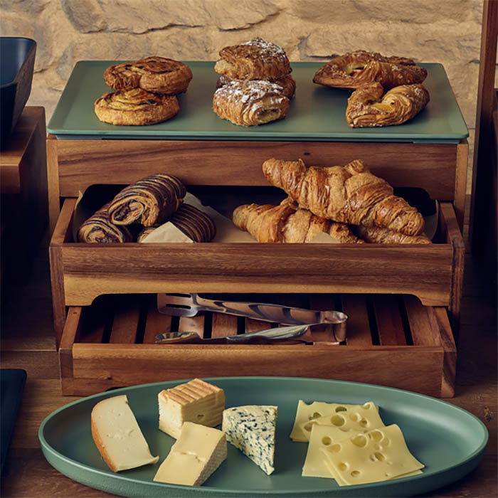 Acacia Wood 3 Tier Display Stand is designed to elevate food presentation for any buffet or display within hotels, cafes or coffee shops. Crafted from durable acacia wood, it ensures longevity and resilience, ideal for the demands of a bustling setting. Each drawer provides ample display space for pastries, cakes and breads, offering both functionality and visual appeal. When not in use, the drawers conveniently retract, saving valuable space for storage. The display stand also has a GN 1/1 footprint which ensures consistency with other GN buffetware.