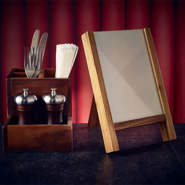 The GenWare Menu Holder combines the warmth of acacia wood with the mkodern touch of an acrylic window, ensuring your menus are both protected and prominently displayed. It's self-standing design adds convenience, allowing you to effortlessly place it on any table or countertop without the need for additional support. Whether you're a restaurant, cafe, bar, or caterign service, the Genware Acacia Wood Menu Holder elevates your brand's presentation.