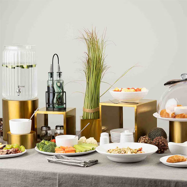 Elevate your presentation with our set of three round nesting risers, designed to showcase your culinary creations with style and sophistication. These versatile risers can be used individually or combined to create a dynamic display, allowing you to highlight dishes and desserts. The upscale gold finish adds a touch of refinement to any setting, while the ample space on each round riser allows you to elevate even large bowls and beverage dispensers. When not in use, the risers conveniently nest together for compact and effortless storage. Perfect for enhancing buffet displays, catering events, or any occasion where presentation matters.