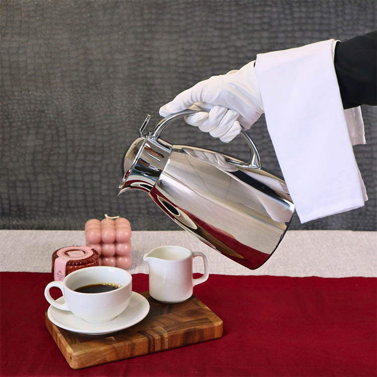 With its ergonomic handle, easy-pour spout, and durable stainless steel body, this jug combines practicality with timeless elegance, making it perfect for hotels, restaurants, and catering services.