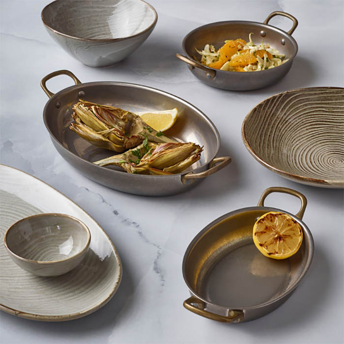 Add a touch of bold, industrial flair to your food presentation with our Vintage Steel Collection.The attractive brass handles add a sophisticated touch, elevating casual dining to a premium experience.Crafted from high-quality stainless steel with a distinctive vintage finish, this collection combines durability and style, offering a unique, industrial finish that enhances any dish. Perfect for both casual and upscale dining settings, these pieces provide a sophisticated yet rugged look that complements a variety of cuisines.