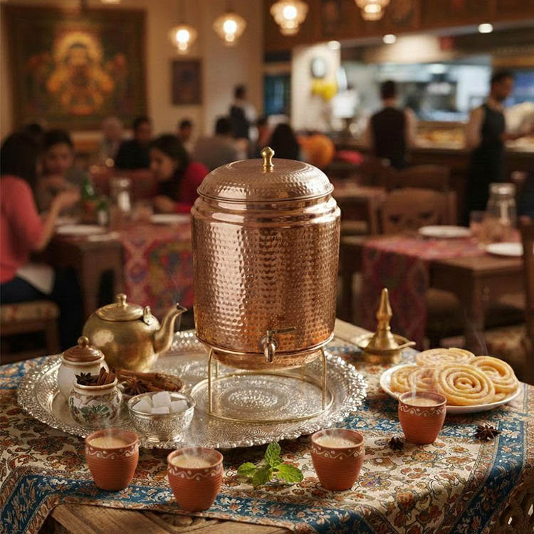 Copper Chai Dispenser 15 Ltr. Chai Dispenser. Amazing way to dispense Chai on the table at you venue. Perfect for a group table that wants chai and looks great on social media too.15L capacity approx.
