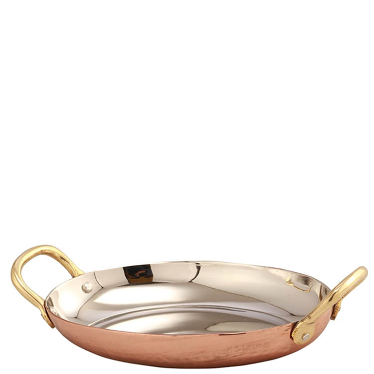 - Elegant Brass Handles: Equipped with sturdy, ergonomically designed rivited brass handles, this dish offers a secure grip for servers while adding a touch of sophisticated gold-toned contrast to the warm copper body.