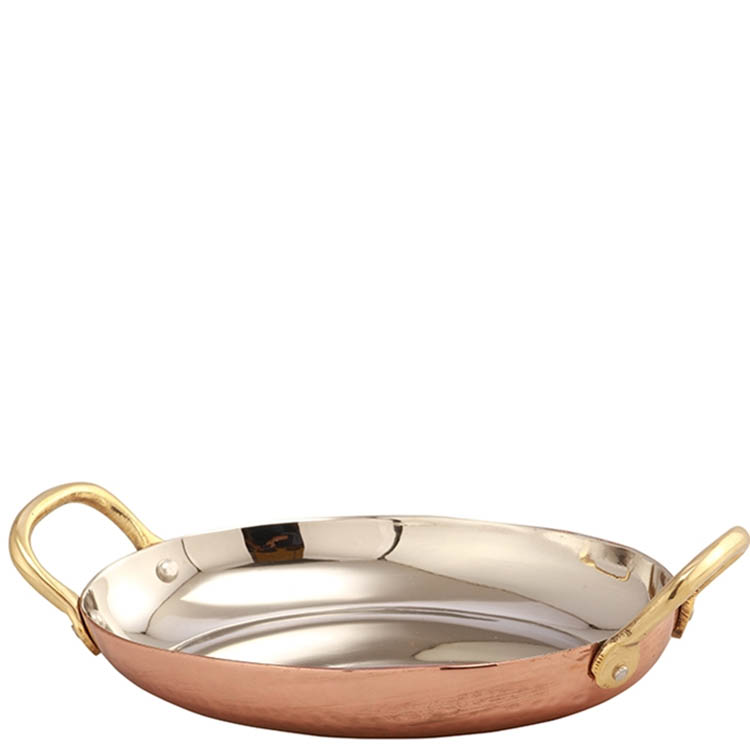 - Elegant Brass Handles: Equipped with sturdy, ergonomically designed rivited brass handles, this dish offers a secure grip for servers while adding a touch of sophisticated gold-toned contrast to the warm copper body.