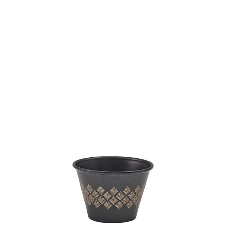 Elevate your condiment presentation with the GenWare Metallic Black Diamond Ramekin. Featuring a stylish black PTFE metallic coating and a precision laser engraved diamond pattern, this ramekin combines function with a bold, contemporary aesthetic. Ideal for sauces, dips, and olives, it's the perfect addition to modern table settings where visual detail matters.