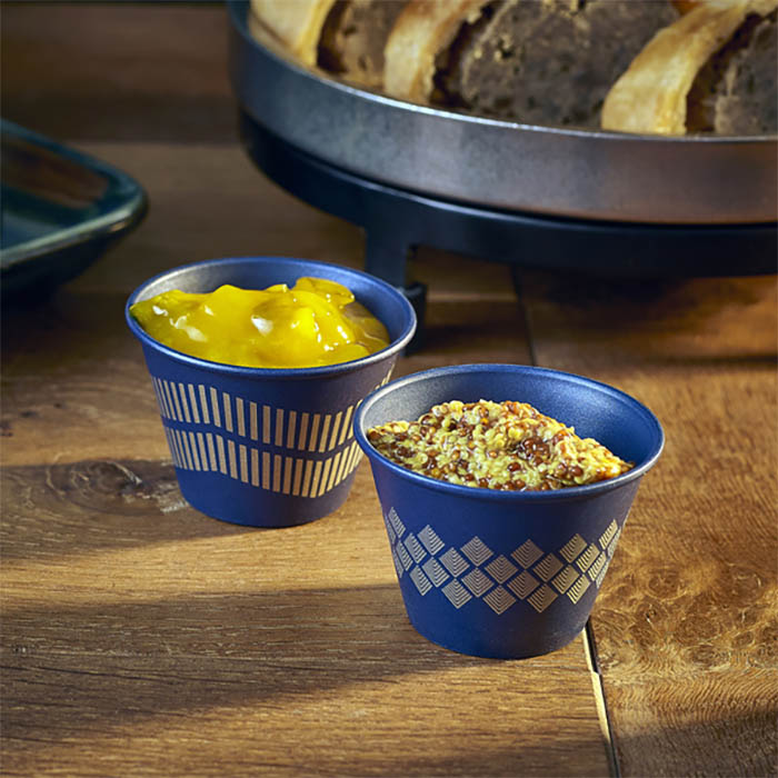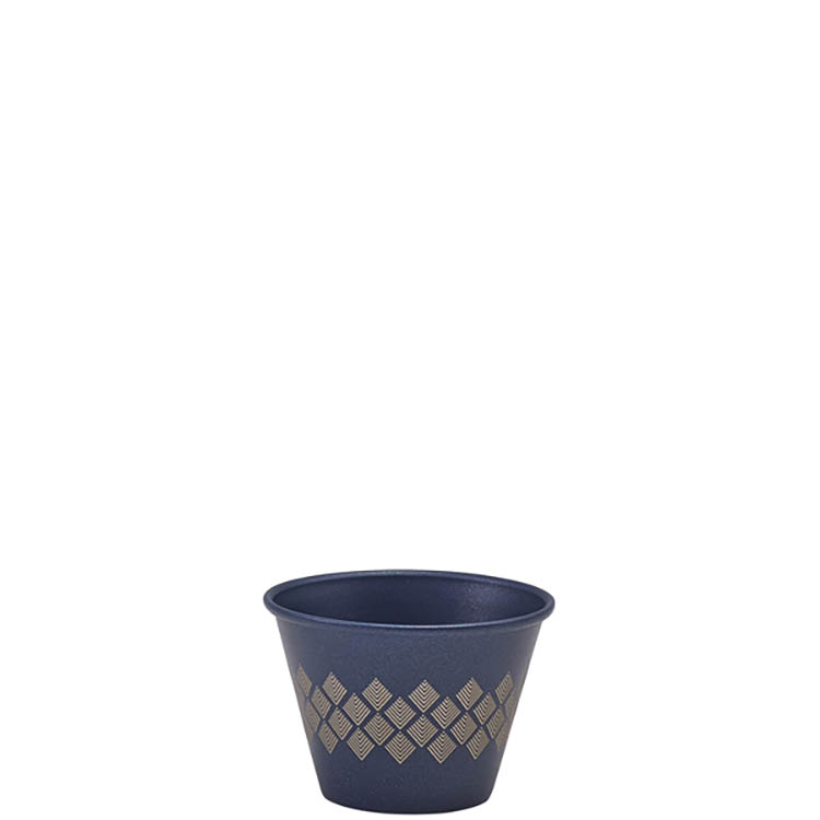 Elevate your condiment presentation with the GenWare Metallic Blue Diamond Ramekin. Featuring a stylish blue PTFE metallic coating and a precision laser engraved diamond pattern, this ramekin combines function with a bold, contemporary aesthetic. Ideal for sauces, dips, and olives, it's the perfect addition to modern table settings where visual detail matters.