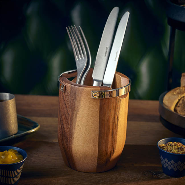 Acacia Wood Cutlery Cylinder with Metal Handles - H 13cm